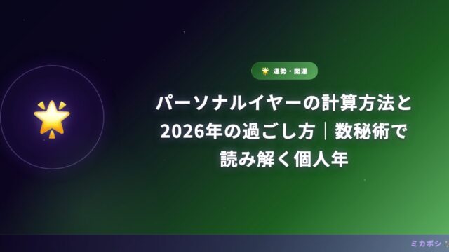 fortuneパーソナルイヤーの計算方法と2026年の過ごし方|数秘術で読み解く個人年 数秘術における「パーソナルイヤー」(個人年)は、あなた自身の1年間の運のサイクルを示す重要な指標です。この概念を理解することで、2026年をより充実させるための戦略が立てられます。パーソナルイヤーの計算方法は意外とシンプルで、生年月日と現在... 2026.03.09fortune